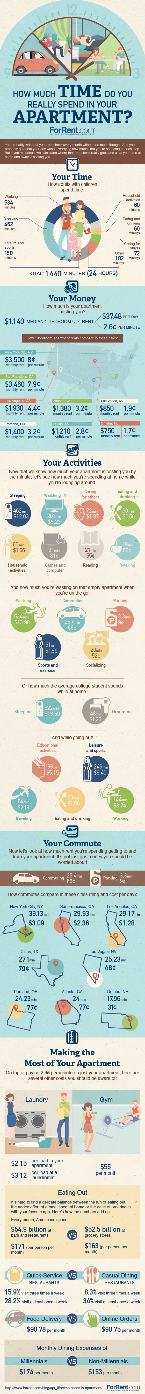 The median rent in the U.S. for a 1-bedroom is $1,140 a month. That means rent is costing us $37.48 per day, and 2.6¢ per minute. But what are we doing when we’re hanging out in our apartment, and how much is it costing us? For Rent looked at the numbers in this infographic about how much time we really spend in our apartments. The numbers are interesting, and at times surprising. Eating and drinking at home take up 60 minutes daily, at a cost of $1.56, and sleeping, at 462 minutes each day, costs $12.03 daily. Check out the other interesting statistics in this infographic.